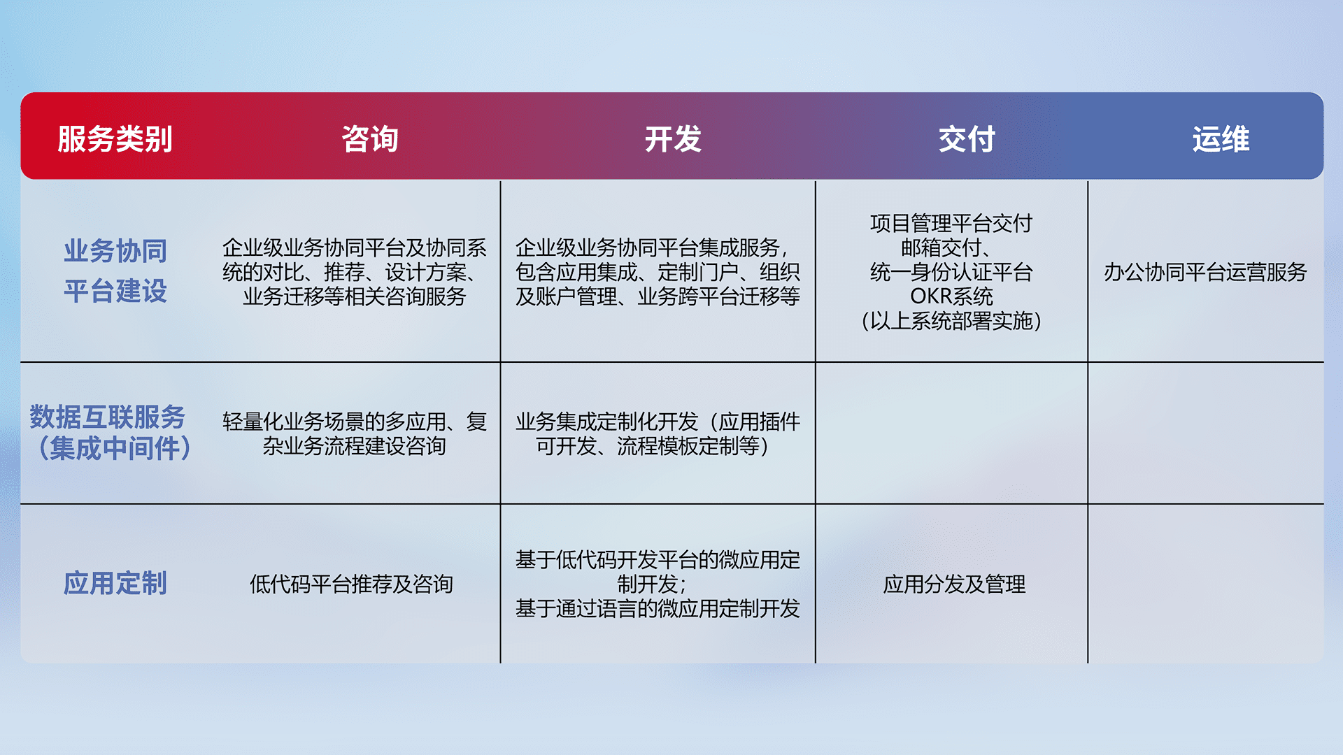 针对钉钉、、、、企微、、IDaas等平台级产品提供产品的规划、、、、方案、、、、交付、、定制化开发等服务,,,,实现如统一协同办公、、、智能客户服务、、、混合会议管理、、、、智能数据查询、、、、等业务场景,,,,实现数字化转型。。。